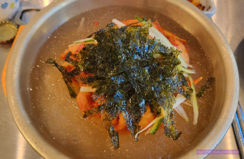 식사류는 김치말이국수를 먹었습니다. 국수에는 오이와 김치 그리고 김과 얼음이 있습니다. 정말 시원하기 때문에 고기를 드시고 후식으로 드시면 정말 딱 입니다.