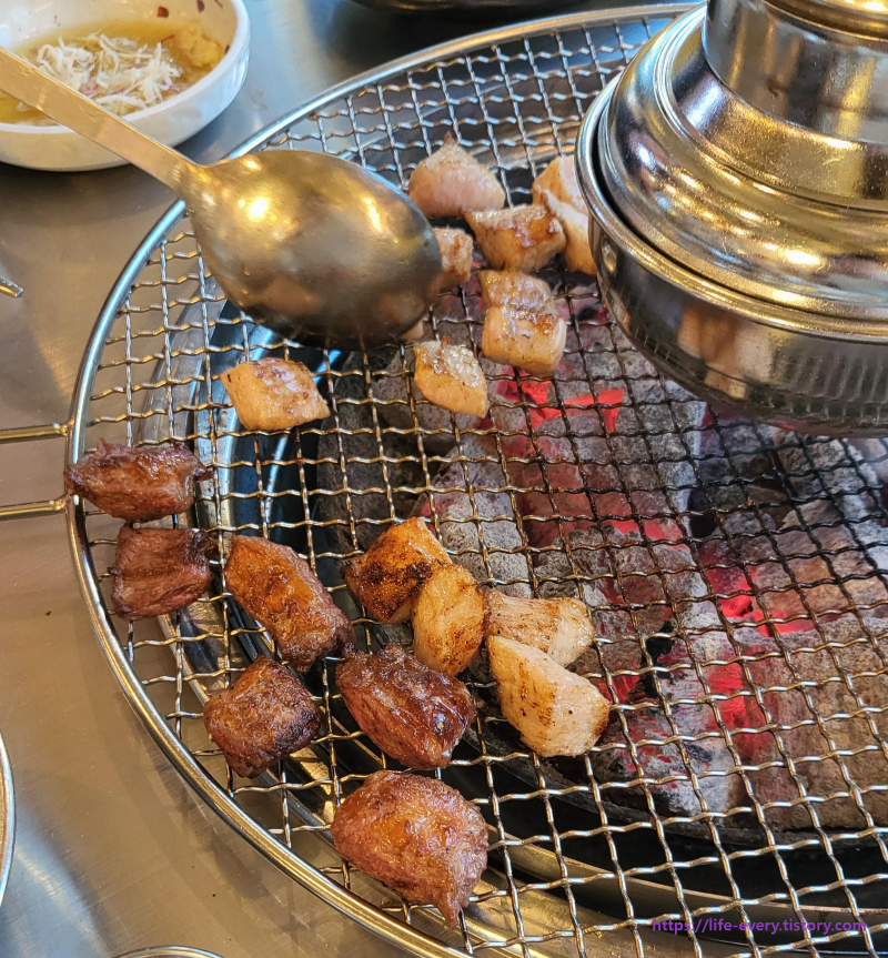 갈매기살의 경우 진한 고기 육즙과 맛을 느낄 수 있었고 와사비 또는 멜젓에 찍어 먹었을 때 맛있었습니다.