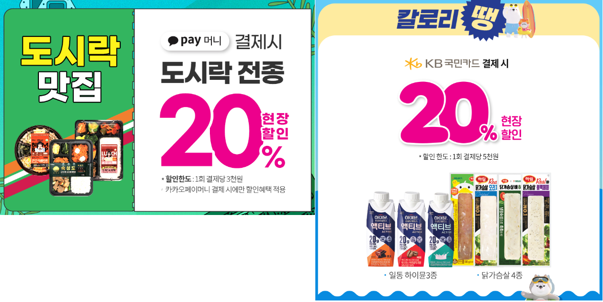 칼로리 땡 이벤트의 경우 KB 국민카드 결제 시 아래 품목에 대해서 20% 현장할인을 받으실 수 있습니다.