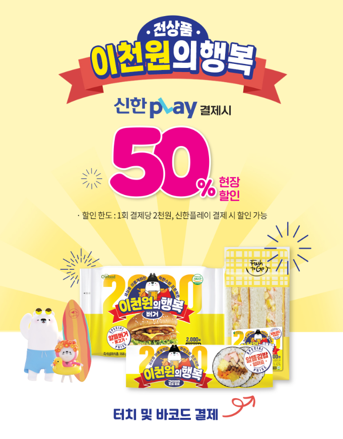 세븐일레븐 8월 이벤트 이천원의 행복은 8월 31일까지 진행하는 이벤트로, 이천원의 행복 푸드 3종에 대해서 신한 PLAY로 결제 시 50% 현장할인을 해주는 이벤트 입니다.