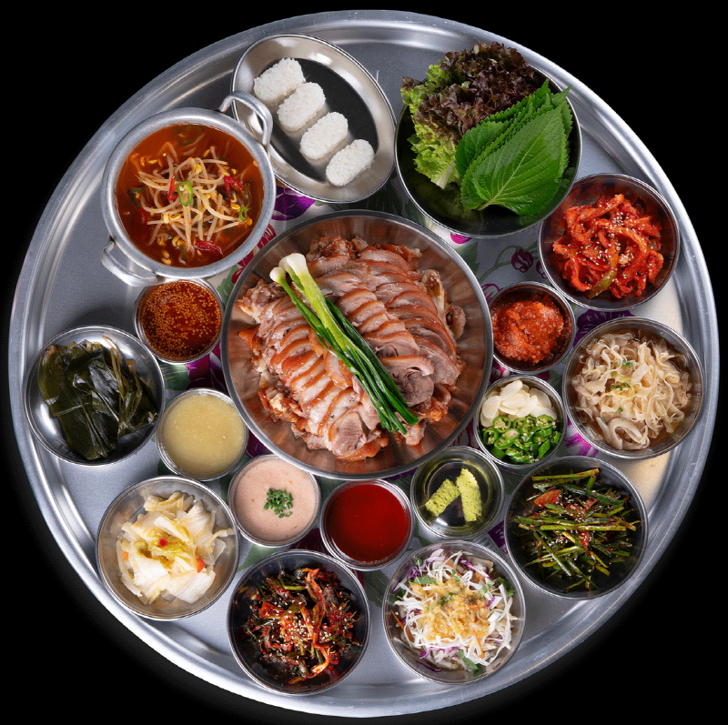 이러한 한상차림에는 명란쌈장, 부추무침, 명이나물, 상추, 깻잎, 무김치, 파김치, 족발초밥, 마늘소스, 냉채소스, 고추, 마늘, 백김치, 초장, 생와사비, 콩나물국, 양파간장, 새우젓, 파숙지, 쌈장이 제공됩니다. 족발의 맛만을 즐길 수도 있고, 각종 소스와 즐길 수도 있고 물릴 것 같으면 쌈으로도 즐기실 수 있습니다.