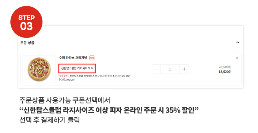 아래 그림을 누르시면 파파존스 사이트로 이동할 수 있고, 해당 사이트를 통해서 신한 Tops Club 접속하셔서 쿠폰을 받으시기 바랍니다.