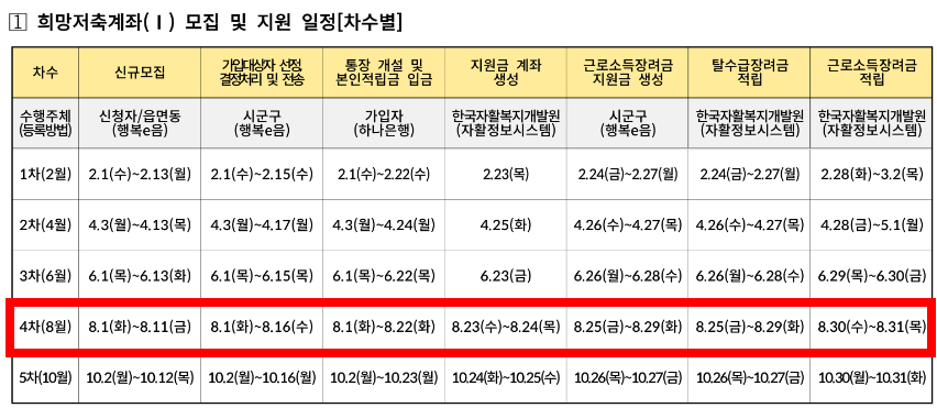 희망저축계좌 (I) 모집 기간은 8.1 부터 11일까지 입니다. 지원 방법은 온라인 복지로 사이트에서 지원하거나, 직접 주민센터를 방문하셔서 방문접수를 하시면 됩니다.