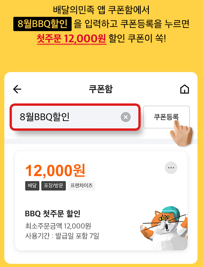 배달의 민족 앱 쿠폰함에서 쿠폰코드 : 8월BBQ할인 을 입력하고 등록을 누르면 12,000원 할인 쿠폰을 받으실 수 있습니다.