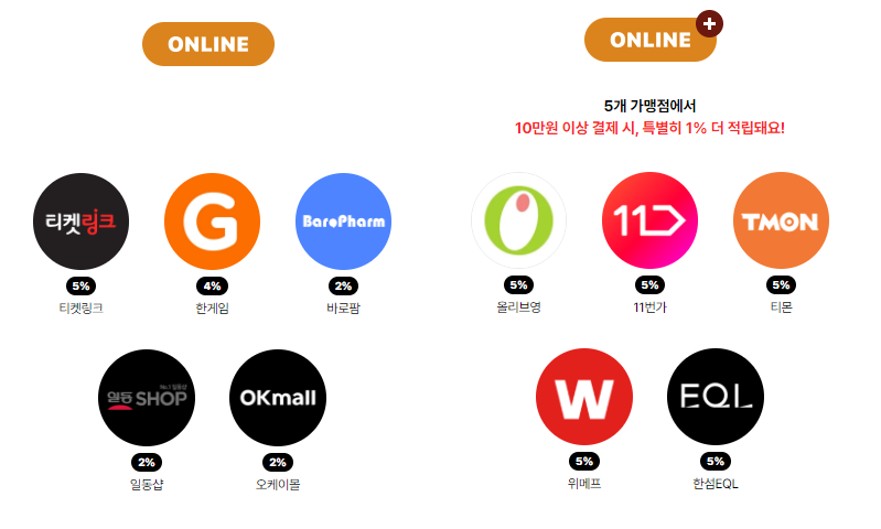 | 온라인 | 1000 point | 올리브영(5%), 티몬(5%), 위메프(5%), 한섬EQL(5%), 티켓링크(5%), 11번가(5%) |